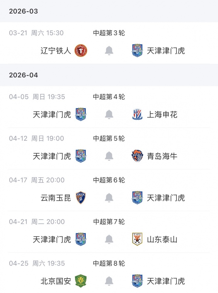 津门虎是本赛季被扣分最多的球队,以负10分开始本赛季的中超征程,他们两轮1平1负未能取胜,目前负9分垫底,在四月份,他们还将对阵申花、泰山、国安等强队。